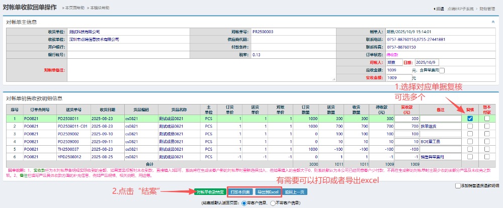 3.查询之后,在下方会得出对应的收款对账单,确认对账单价以及收货数量待收款,点击确认复核收款,最后点击提交