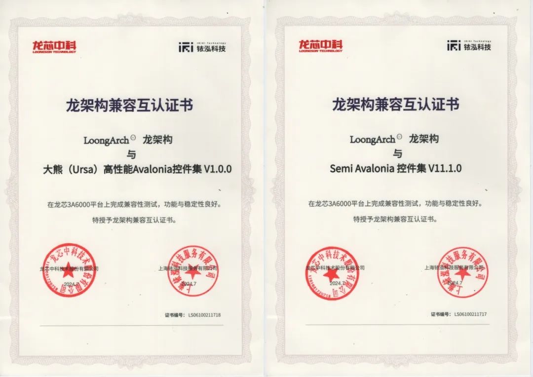 大熊Ursa和Semi两大Avalonia控件集已经完成与龙芯3A6000和龙架构(LoongArch™)的兼容互认证。这一重要的里程碑标志着我们在推进自主可控和国产化技术方面取得了新的进展。