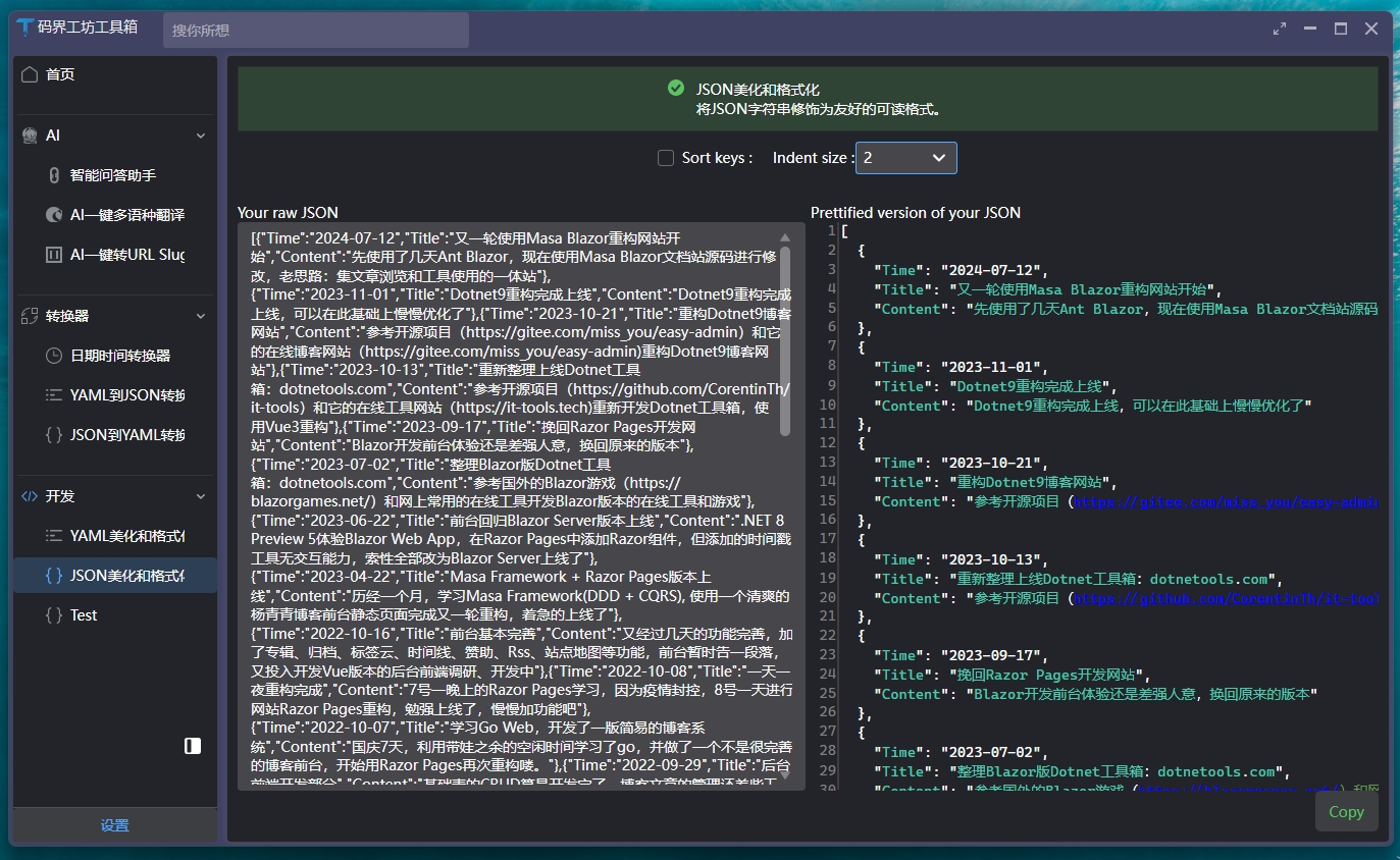 同时,包含实用的 Json 美化工具和 YAML 转 Json 工具,分别如下图所示: