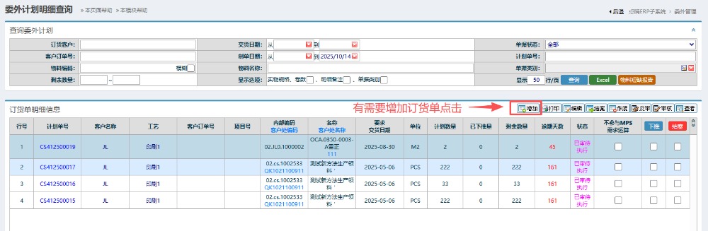 4.如果有需要增加委外加工计划的话,可以按下图操作:点击增加