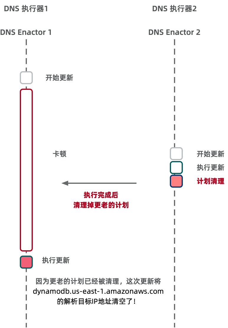 今天 AWS 官方发布了 10-20 日美东大故障 的事后复盘报告,细节比较丰富,算是少有的第一手资料。所以老冯把它翻译成了中文,并附上解读与评论,供大家参考。 ![]() Amazon DynamoDB 服务中断总结我们希望就2025年10月19日至20日发生在美国东部弗吉尼亚北部(us-east-1)区域的服务中断事件向您提供一些补充信息。此次事件始于10月19日 PDT23:48,结束于10月20日 PDT14:20。在此过程中,客户应用的影响大致可分为三个不同阶段: 首先,10月19日23:48至10月20日02:40,Amazon DynamoDB 在美国东部(弗吉尼亚北部,us-east-1)区域的 API 错误率显著升高。 其次,10月20日05:30至14:09,网络负载均衡器(Network Load Balancer,NLB)在该区域出现部分负载均衡实例连接错误率上升的情况(源于 NLB 集群的健康检查失败)。 第三,10月20日02:25至10:36,新的 EC2 实例启动均告失败;尽管从10:37开始实例启动逐步恢复成功,但部分新启动实例出现了网络连接问题,直到13:50才完全解决。 ![]() DynamoDB2025年10月19日23:48 至 10月20日02:40期间,美国东部(弗吉尼亚北部,us-east-1)区域的 Amazon DynamoDB API 错误率显著升高。在此期间,所有依赖 DynamoDB 的客户应用和其他 AWS 服务都无法与该服务建立新的连接。此次故障由 DynamoDB 服务的自动化 DNS 管理系统中的一个潜在缺陷所触发,该缺陷导致 DynamoDB 服务端点的 IP 地址解析失败。 AWS 许多大型服务都高度依赖 DNS 来实现无缝扩展、故障隔离与恢复、低延迟以及数据就近访问。例如,DynamoDB 在每个区域维护着数十万条 DNS 记录,以管理该区域内庞大且异构的负载均衡集群。通过自动化频繁更新这些 DNS 记录,可以在新扩容资源上线时立即添加对应记录,正确应对硬件故障,并高效地分配流量,优化客户体验。该自动化系统针对高弹性进行设计,使服务能够从各种运行问题中快速恢复。除了提供公共区域端点以外,该系统还维护了多个 DynamoDB 的动态 DNS 端点,包括符合 FIPS 标准的专用端点、IPv6 专用端点,以及账号级别的专属端点。 此次问题的根本原因在于 DynamoDB DNS 管理系统中存在一个潜伏的竞态条件(race condition)。该竞态问题导致服务的区域端点 (dynamodb.us-east-1.amazonaws.com) 的 DNS 记录被错误地清空,而自动化系统未能及时纠正这一状况。为解释这一情况,我们需要先介绍 DynamoDB DNS 管理系统的架构。出于高可用性的考虑,该系统分为两个相互独立的组件: •DNS 规划器(DNS Planner):监控负载均衡器的运行状况和容量,并定期为服务的每个端点创建新的 DNS “方案”(plan),其中包含一组负载均衡器及其权重。我们为整个区域生成统一的 DNS 方案,因为当多个端点共享资源容量时(例如公共区域端点和新推出的 IPv6 端点),统一的方案极大地简化了容量管理和故障处理。•DNS 执行器(DNS Enactor):被设计为几乎无依赖,以便在任何场景下都能独立运行恢复。DNS 执行器负责将 DNS 方案应用到 Amazon Route 53 服务中。为增强弹性,我们在三个不同的可用区(AZ)中各部署了一个完全独立运行的 DNS 执行器实例。每个 DNS 执行器都会监听新的方案生成,并通过 Route 53 事务尝试将当前方案替换为新方案。这种机制可确保即使有多个 DNS 执行器并发地更新同一端点,也能让该端点应用一致的方案。 此次竞态条件源于两个 DNS 执行器之间一次极为罕见的交互。正常情况下,DNS 执行器获取最新方案后,会依次将其应用到服务的各个端点上。这个过程通常非常迅速,能够确保 DNS 状态保持最新。在开始应用新方案之前,DNS 执行器会一次性检查其即将应用的方案是否比之前的方案更新。在遍历端点列表应用方案的过程中,如果某个 DNS 执行器在更新某端点时被另一执行器暂时阻塞,它将反复重试直到成功。 在本次事件发生前夕,一台 DNS 执行器在更新多个端点时遭遇了异常高的延迟,不得不对几个 DNS 端点进行了多次重试。当它以缓慢的速度逐步处理这些端点时,又发生了几件事:首先,DNS 规划器继续运行并生成了多代更新的方案;其次,另一台 DNS 执行器开始应用其中一个较新的方案,并快速地完成了对所有端点的更新。这一系列操作在时间上的巧合触发了那个潜伏的竞态条件。 当第二台(较快的)DNS 执行器完成端点更新后,它启动了方案清理进程,该进程会删除所有比刚应用方案“陈旧得多”的旧方案。恰在此时,第一台(较慢的)DNS 执行器终于将其早已过期的方案应用到了 DynamoDB 的区域主端点,结果把较新的方案覆盖掉了。由于该执行器在开始应用时所做的新旧方案校验因长时间延迟而变得过期无效,所以未能阻止旧方案覆盖新方案。随后,第二台执行器的清理进程检测到这个过期方案(相对于它刚应用的方案已过多代),便将其删除。随着这一方案被删除,该区域端点的所有 IP 地址也从 DNS 记录中被移除了。而且由于活动方案被移除,系统陷入不一致状态,导致之后无论哪台 DNS 执行器都无法再成功应用新的方案。最终,我们不得不通过人工干预来纠正这一状况。 ![]() 当上述故障于 PDT 时间10月19日23:48 出现后,所有通过公共端点连接美国东部(弗吉尼亚北部,us-east-1)区域 DynamoDB 服务的系统立刻遭遇 DNS 解析失败,无法连接至 DynamoDB。这不仅影响了客户流量,也影响了依赖 DynamoDB 的 AWS 内部服务流量。启用了 DynamoDB 全局表(Global Tables)的客户虽然能够对其他区域的副本表成功发出请求,但与 us-east-1 区域对应副本之间出现了严重的复制延迟。