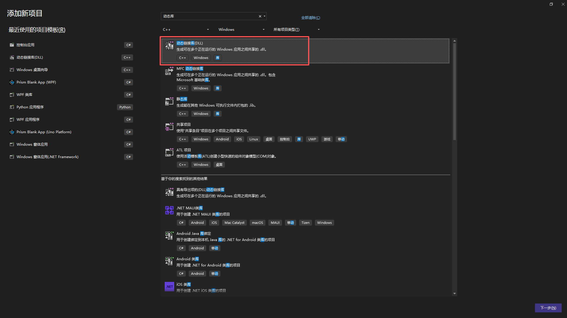 输入项目名称HelloDll,然后下一步
