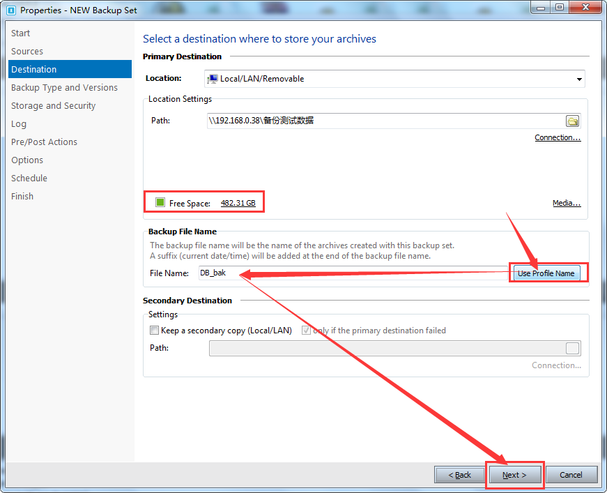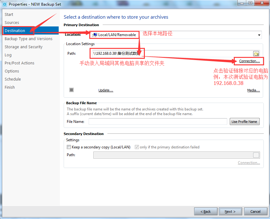 第三步,选择目的地备份方式,支持本机、局域网内其他电脑共享目录、FTP等多种备份方式,下面以备份文件保存到本地局域网内其他电脑(192.168.0.38)共享目录为例,操作如下图所示: